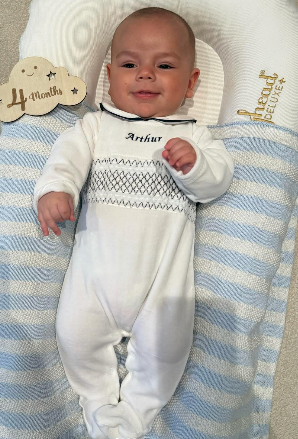 100% Velour Cotton Spanish Baby Grow – White & Blue